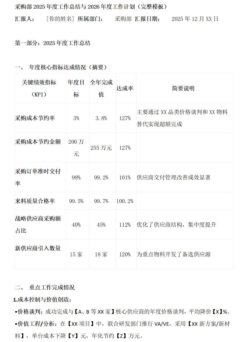 • 成本控制: 2025年总采购成本节约率是多少?对比年度目标完成情况。重点展示1-2个通过战略寻源、价格谈判、价值工程实现的重大降本案例。