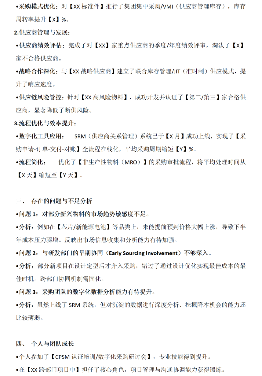 • 流程优化: 例如,“推动了XX品类的采购合同标准化,将平均审批周期从X天缩短到Y天”。