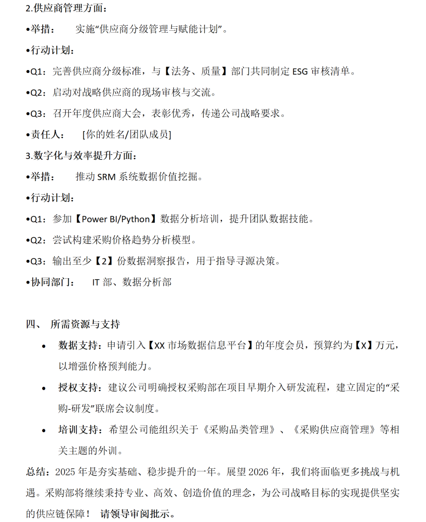 • 例如: “2026年,采购工作的核心思路将从‘保障供应’向‘价值创造’深化,重点聚焦于供应链韧性构建、数字化转型落地、以及ESG绿色采购三大方向。”